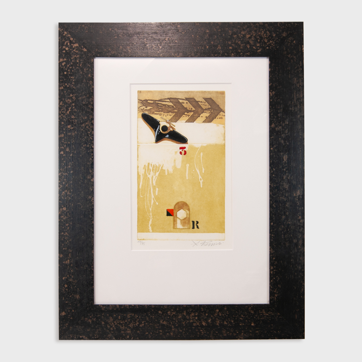 Dal punto di vista cromatico, Il volo utilizza tonalità calde e terrose, tipiche di molte incisioni artistiche, arricchite da contrasti grafici che emergono con discrezione. Le superfici mostrano leggere variazioni materiche, testimonianza del processo incisorio, che conferiscono all’opera profondità e autenticità.